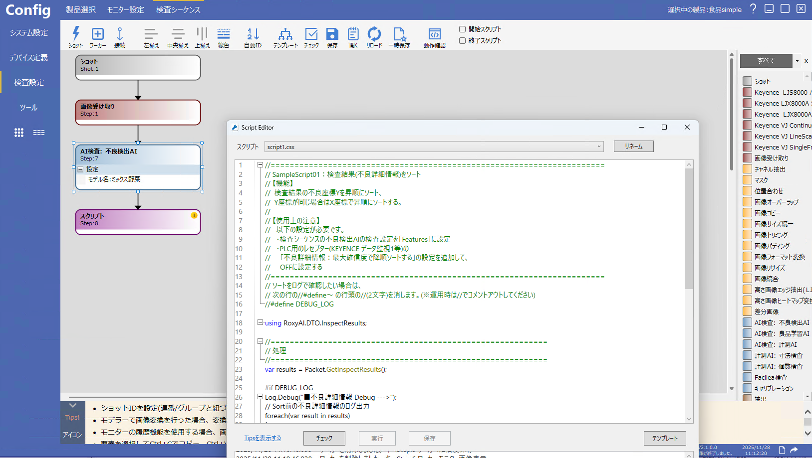 検査の柔軟性を大幅に向上させるスクリプト機能。 しかし、プログラミングが必要なため、不慣れな方には敷居が高い面があります。V2.1.0では不良詳細の並び替え、不良種別の統合、撮影環境変化の事前チェックなど、 実用的なサンプルスクリプトを拡充しました。